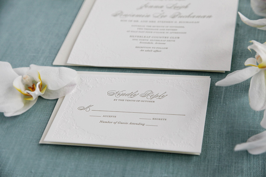 We printed these beautiful black-tie wedding invitations for the lovely bride, Jenna. We designed and printed a blind floral border with gold text on 110# Crane Lettra in pearl. (Blind refers to an impression made without ink.)